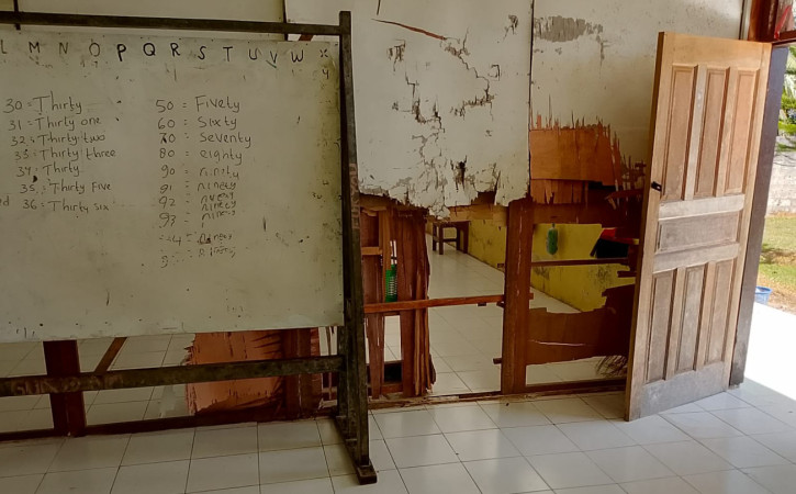 Kalau lihat kondisi gedungnya, kamu bakal geleng-geleng kepala. Plafon ruang kelas sudah amburadul, sebagian nyaris jatuh. Bisa dibilang ini sekolah lebih cocok disebut gubuk belajar daripada institusi pendidikan.
