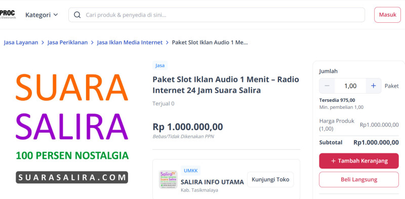 Paket Slot Iklan Audio berdurasi 1 menit di Radio Internet 24 Jam Suara Salira adalah layanan promosi efektif untuk instansi pemerintah. Dengan jangkauan global, jumlah pendengar aktif yang setia (hingga 2.000 pendengar bersamaan), serta penempatan iklan di prime spot (awal jam), produk ini mendukung komunikasi publik pemerintah secara luas, transparan, dan efisien. Link di InaProc
