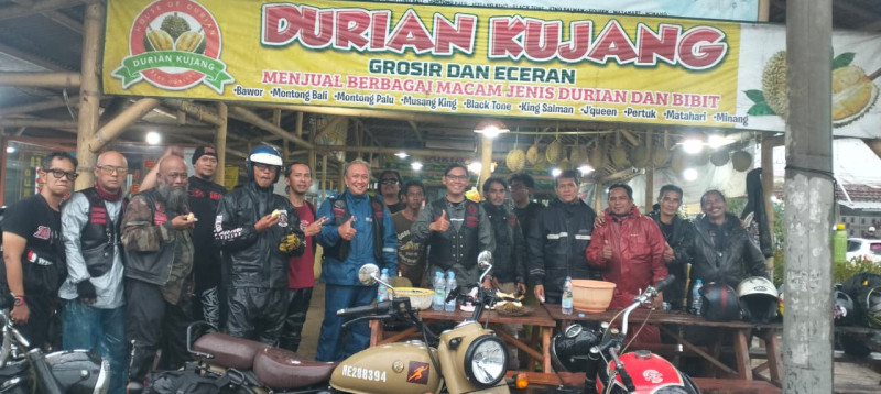 Bukan sekadar berhenti biasa, kedatangan para bikers ini langsung menarik perhatian warga sekitar. Motor besar, jaket riding, dan suasana santai khas komunitas moge berpadu dengan aroma durian yang menggoda dari kedai yang ada di pinggir jalan tersebut.